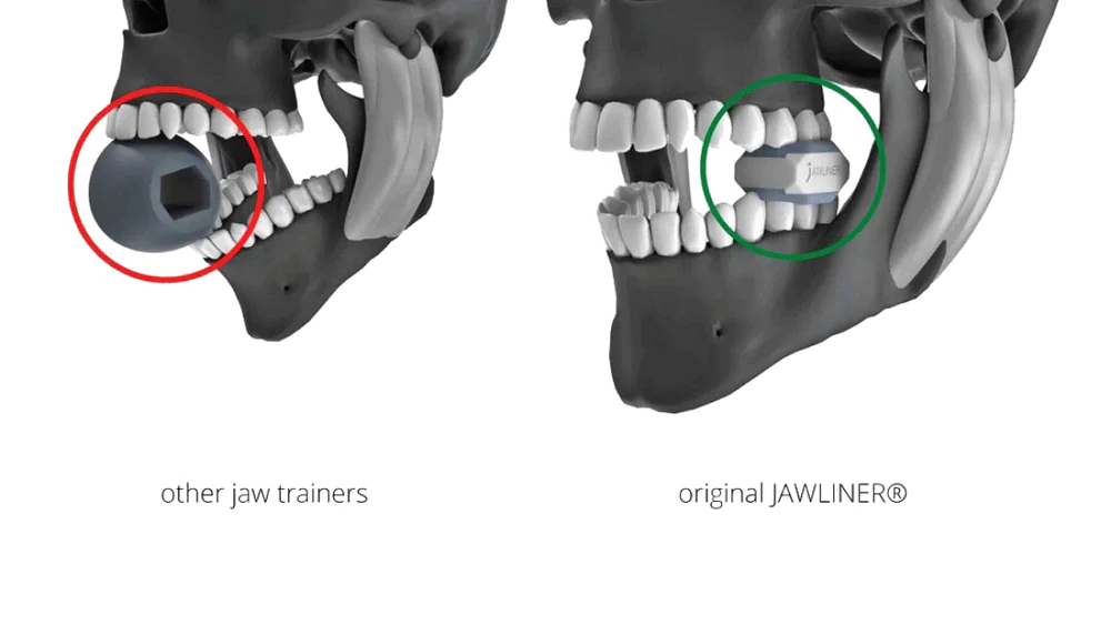 - JAWLINER® : Unlike front-mouth trainers, JAWLINER is designed to be used with the back molar teeth. Molars are naturally built for grinding and chewing tough foods, making them ideal for safe and effective jaw muscle training.